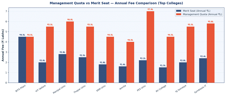 💡 Management quota fees are typically 1.5× to 3× higher than merit seat fees. However, the ROI is justified when placement outcomes are strong — especially at Tier 1 colleges.
