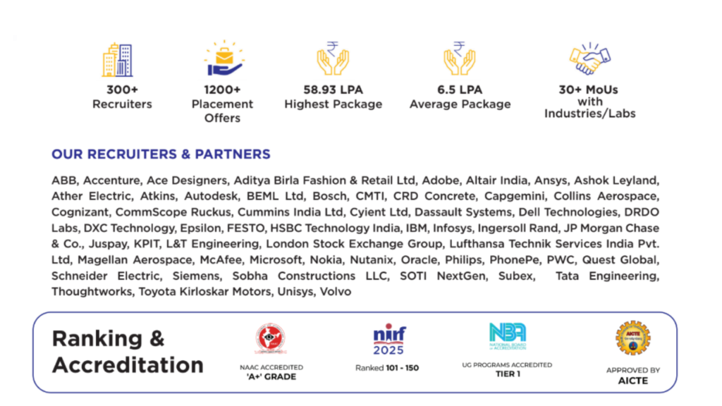 NMIT is approved by the All-India Council for Technical Education (AICTE), affiliated to VTU (Belagavi), and holds NBA accreditation for several programmes. Its proximity to tech parks such as Manyata Tech Park and KIADB Aerospace SEZ makes it especially attractive for students targeting core engineering and IT roles.