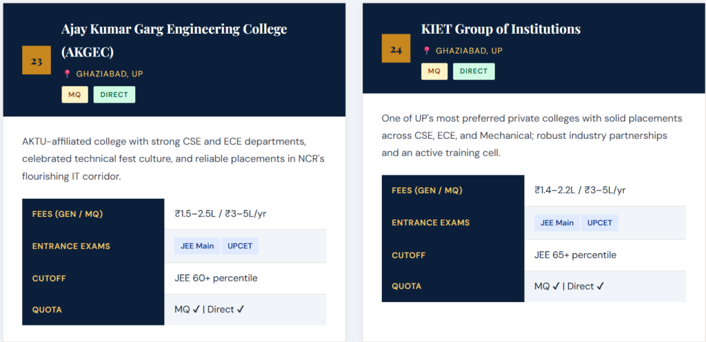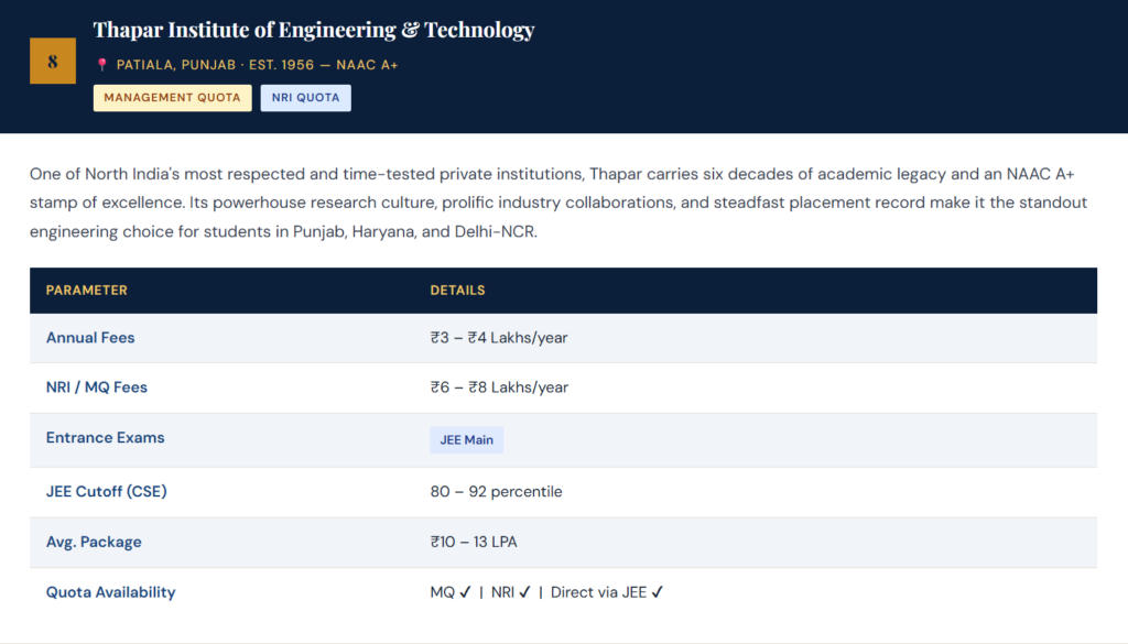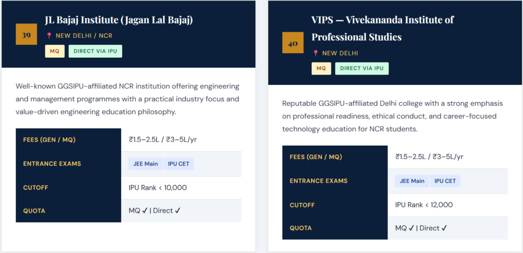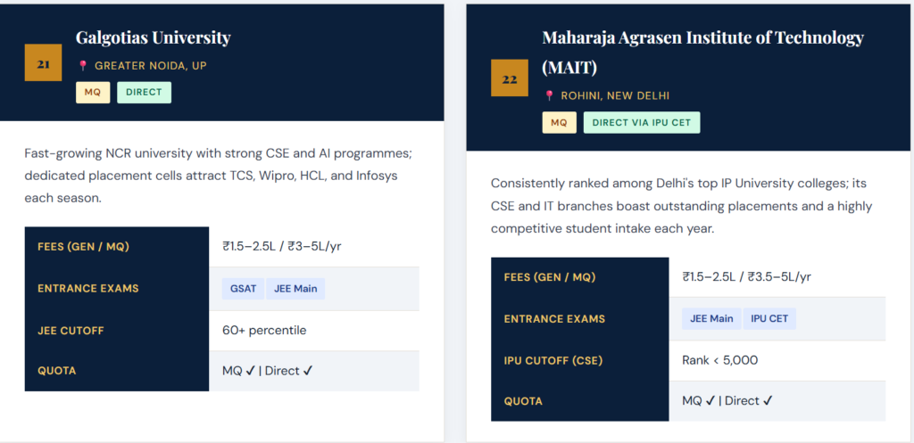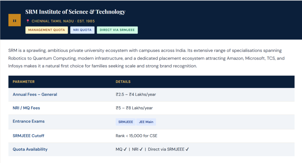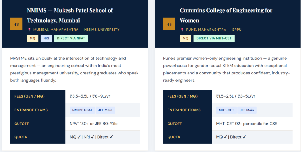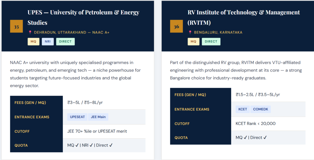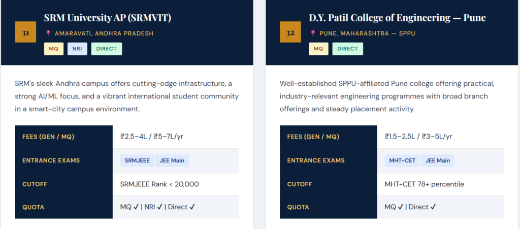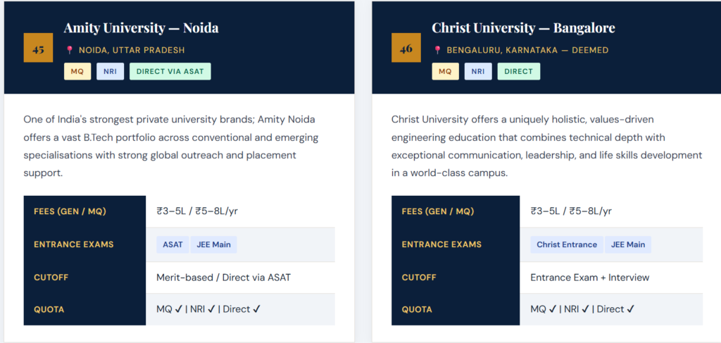 Each profile includes a descriptive overview, approximate annual fees across quota types, accepted entrance examinations, and indicative cutoff benchmarks for 2026–27. Always verify directly with the institution. 👉 Top 50 Private Engineering Colleges for Direct Admission (2026 Guide)