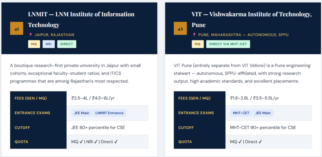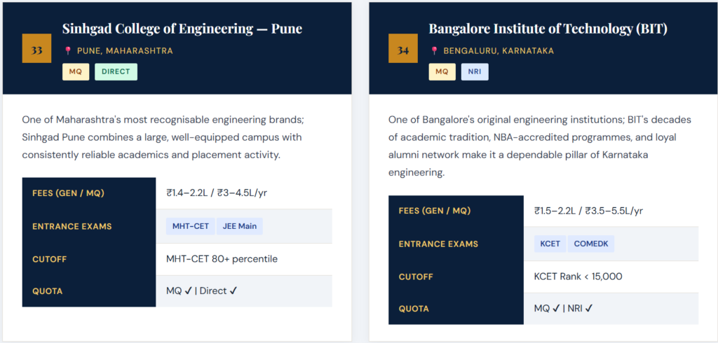 Disclaimer: All fee figures, cutoff ranks, and entrance exam details in this article are approximate and indicative for 2026–27. Management quota and NRI quota seats involve additional charges beyond base tuition. Actual fees vary by branch, campus, and admission year. Always verify current figures directly with the institution or an authorised admission consultant before making financial commitments.